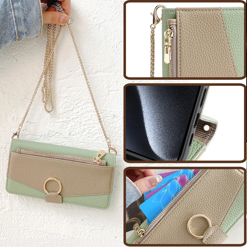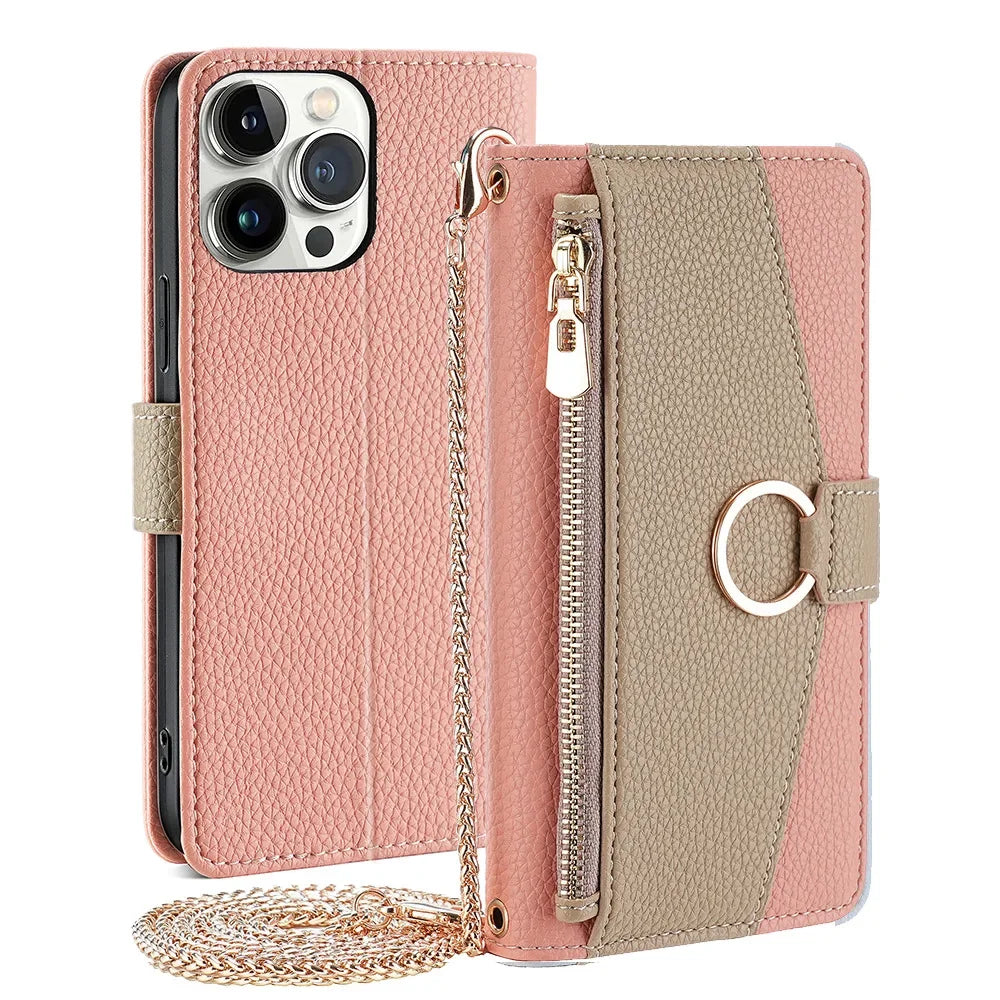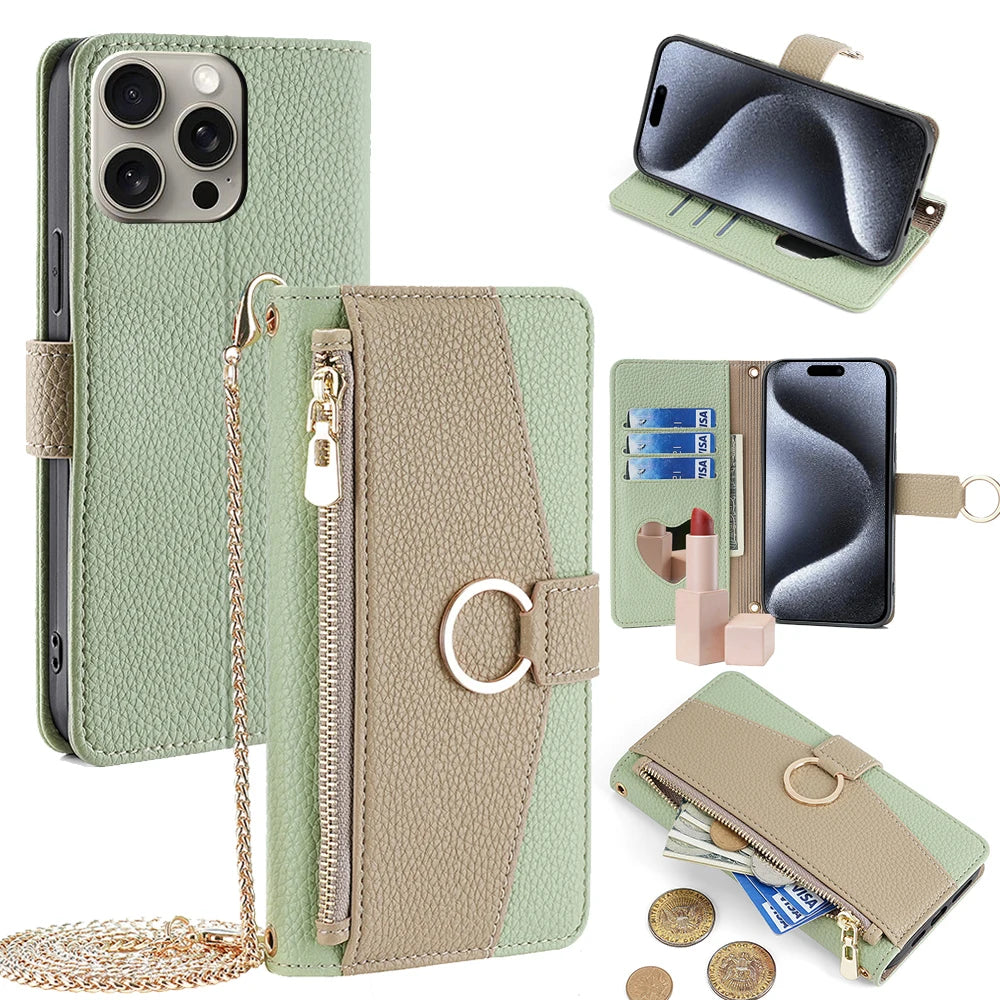 Crossbody Leather Zipper Wallet Case for iPhone Flip Mirror Cover Long Lanyard