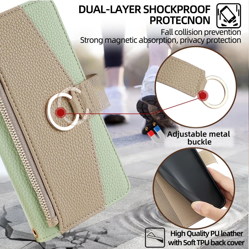 Premium crossbody leather wallet case designed for iPhone flip mirror covers with extended lanyard attachment. Constructed from durable PU leather with anti-scratch and dustproof protection. Features multiple storage compartments, protective ring attachment, and versatile pattern and texture options. Engineered for everyday carry with secure closure and reliable device protection.